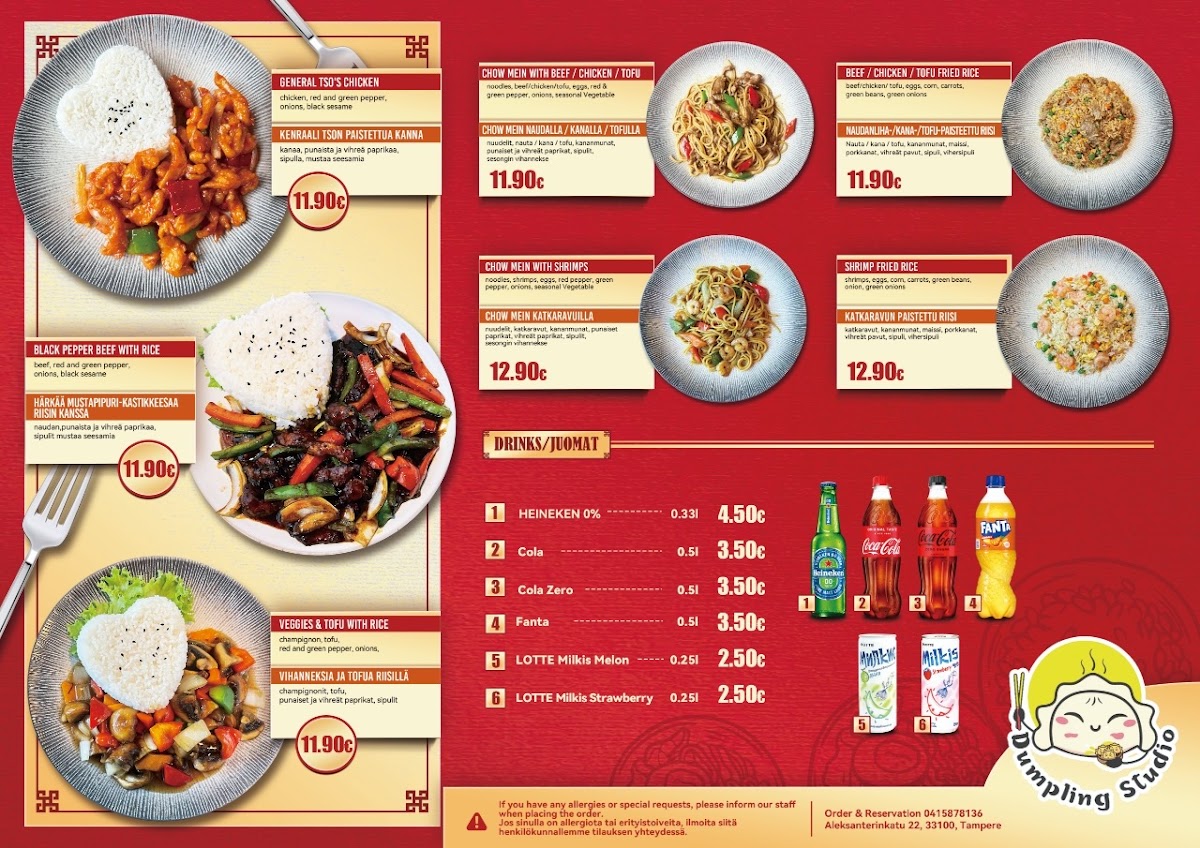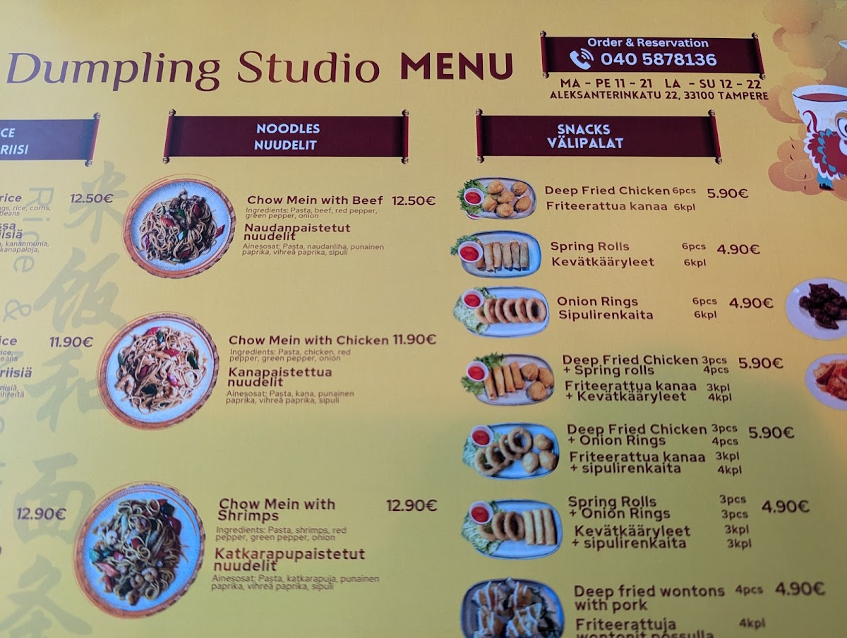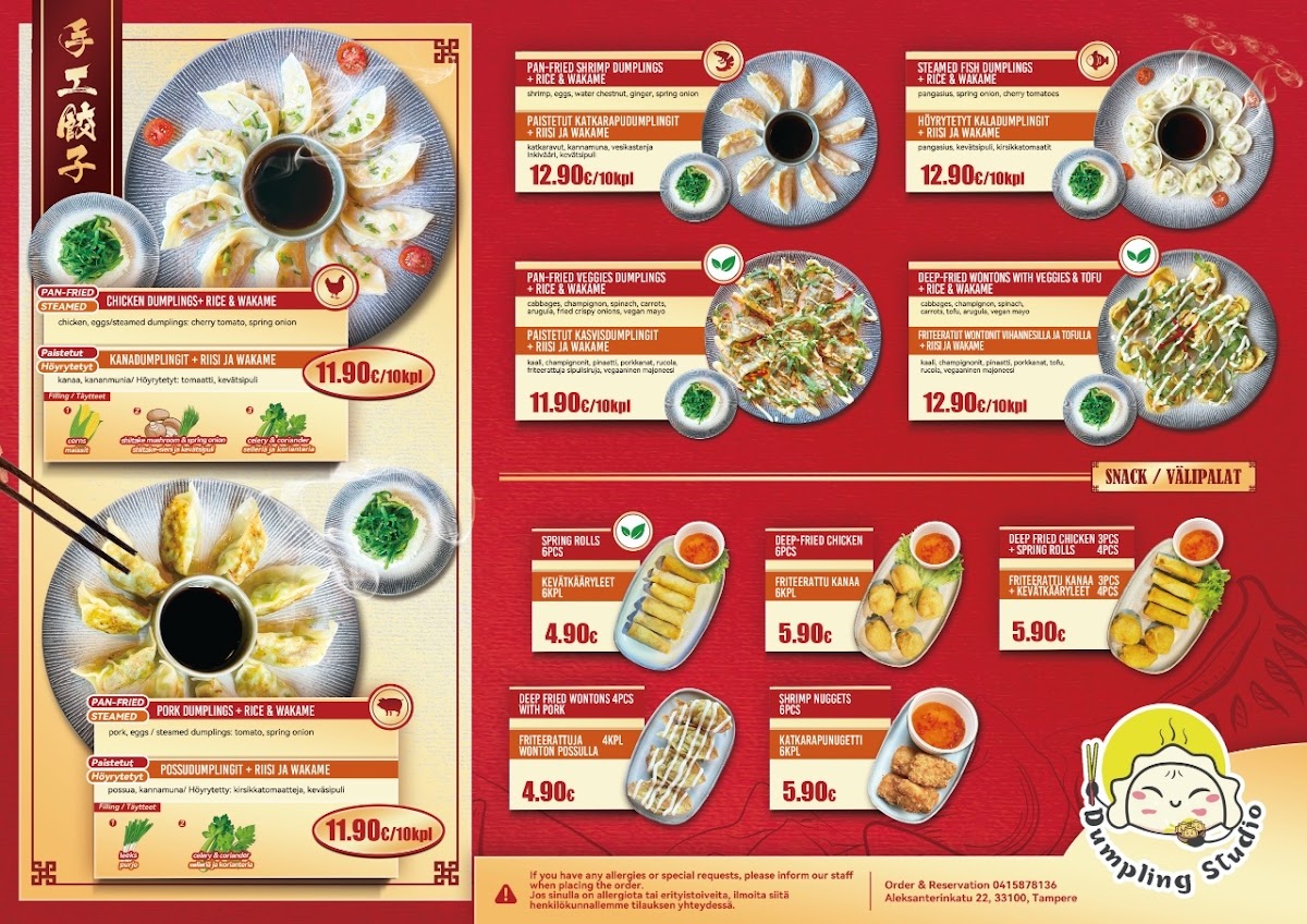 Welcome to Dumpling Studio, a hidden gem nestled in the heart of Tampere, Finland, located at Aleksanterinkatu 22. This charming eatery is dedicated to bringing the art of dumpling-making to the forefront, offering an array of freshly crafted dumplings that will tantalize your taste buds.